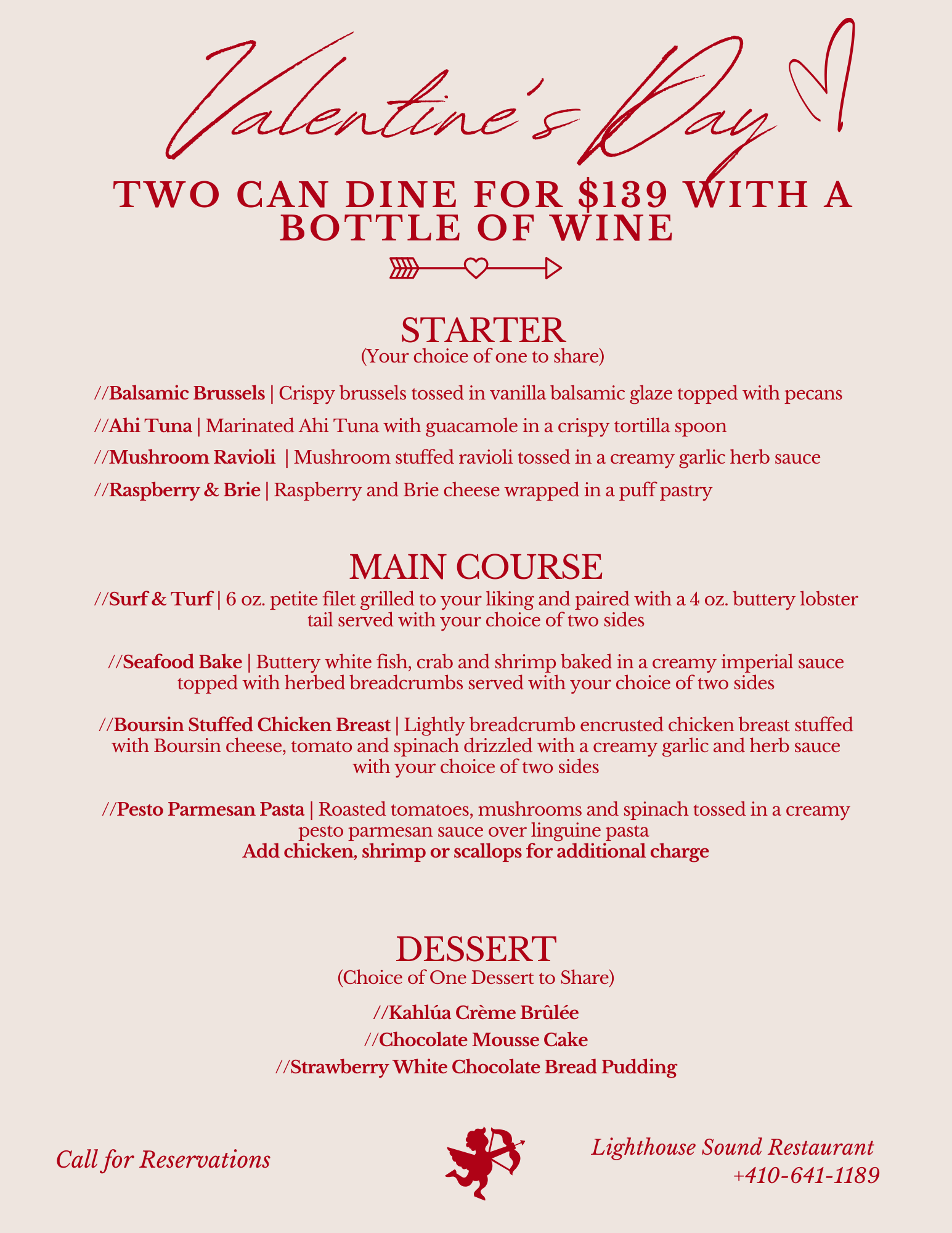 Join us for dinner starting at 4 PM, featuring our regular dinner menu plus our special holiday Two Can Dine menu.